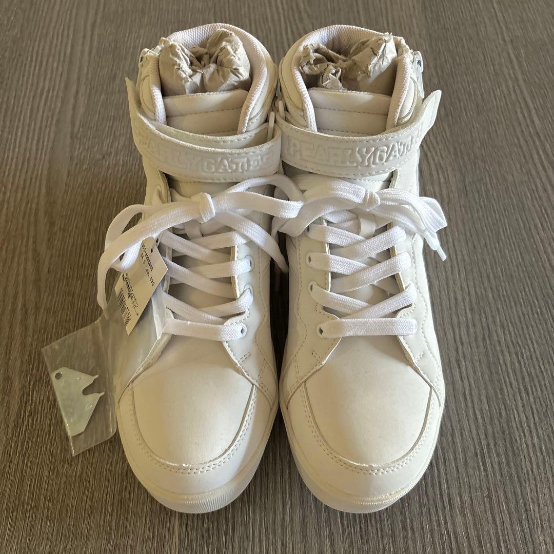 PEARLY GATES パーリーゲイツ\rピンク×ブラックネイビー ローカット ゴルフシューズ \r【商品詳細】\r少し高さのあるソールにあしらったピンクのブランドロゴで存在感を高めた、ピンク×ブラックネイビーのローカットゴルフシューズ。今シーズンを象徴する春風のようなやさしいピンクの色調で、足元からスタイリングを引き立ててくれます。強度と軽量さを両立した合皮素材に、内側には優しい肌あたりとフィット感を実現した通気性に配慮した素材を使用しています。クッション性に優れたミッドソールを装備し、様々なコンディションで優れたグリップ力と歩行性能を発揮するアウトソールとスパイクを使用。レースでしっかりフィットできるため、安定したスウィングと足の動きを最適化したスムーズな体重移動を実現します。長時間の歩行が想定されるコースでも、オシャレを楽しみながら快適なはき心地を保ちます。ポイント交換や締めなおしに便利なスパイクレンチと、持ち運びや保管に便利な不織布巾着付きです。\r■色\rピンク×ブラック系\r■サイズ\r24.5cm\r※個人差あるかと思いますが、当方通常24.5cmを履きますがちょうどいいです。\r■その他\r定価:35,200円\r銀座シックスのthe HOUSEにて購入。外箱、袋あり。\r新品、未使用品タグ付き。3年程前に購入したもので、一度も箱から出すことなく自宅クローゼットに保管してありました。※値下げ不可